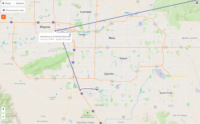 Route Replay gives you a complete picture of an entire route taken from start to finish. Each breadcrumb represents a specific point along the route. Clicking on individual breadcrumbs shows you the exact time the employee was at the location as well as the driving speed.