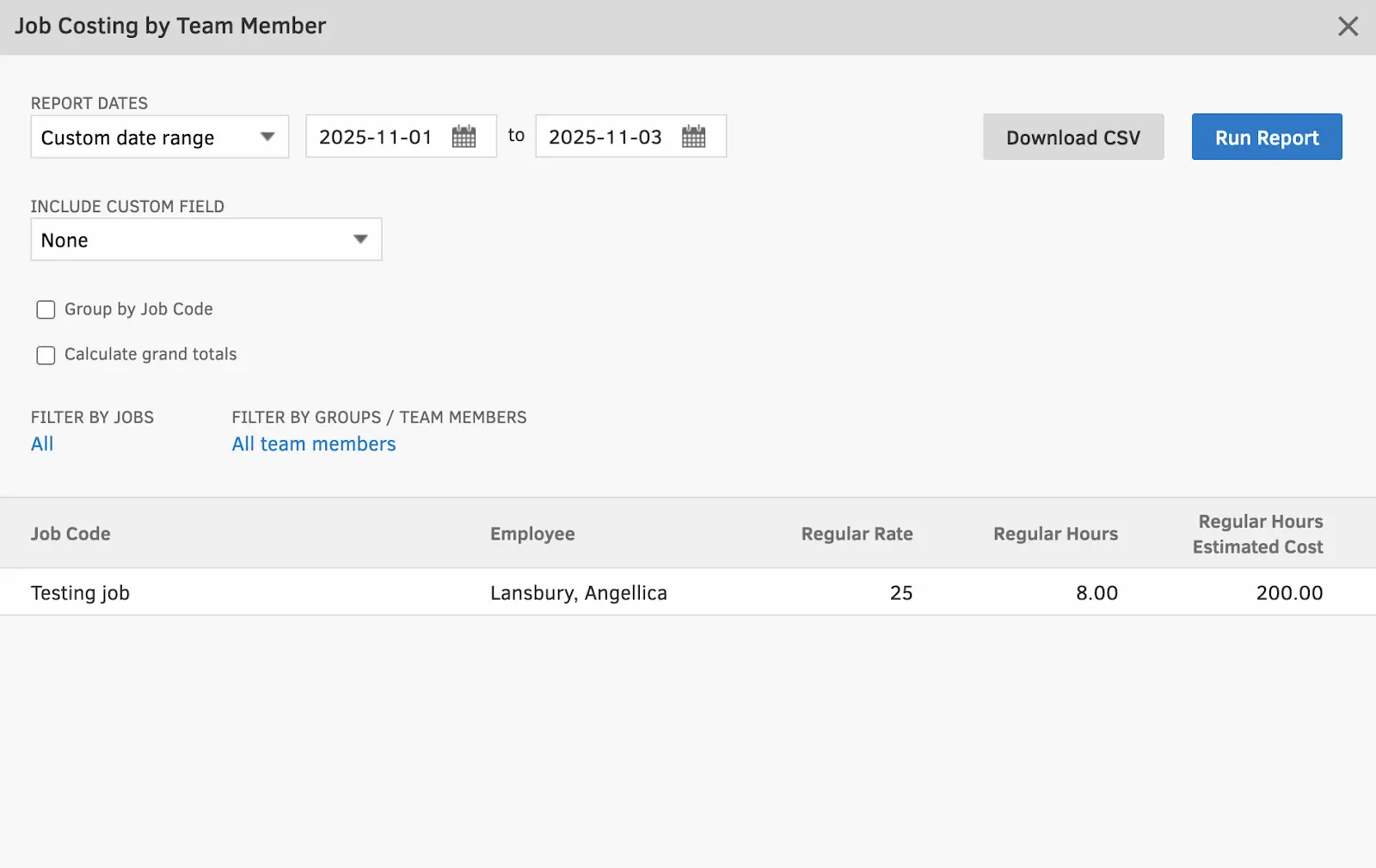 The Job Costing report seems especially useful. It compares estimated versus actual hours per project and helps catch budget overruns early. You can filter by employee, customer, job, or date range and export to CSV or PDF.